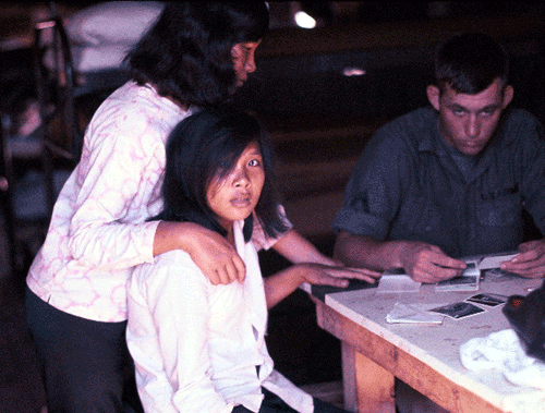 Photo G1910: Unidentified A Company, 720th MP Battalion, 89th MP Group, 18th MP Brigade MP and two barracks "Hooch Maids" in the company compound on Long Binh Post, Bien Hoa Province, III Corps Tactical Zone, Vietnam in 1966. If you can identify this MP, please use this Email Link. Courtesy of PFC Carson J. Sabine, A Company, 720th MP Battalion, October 1966 to October 1967. |